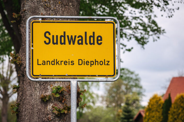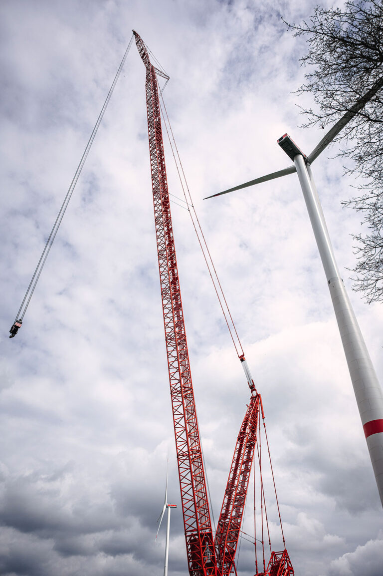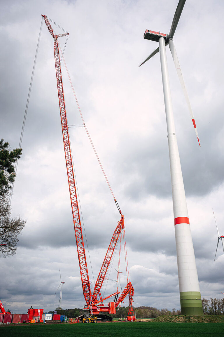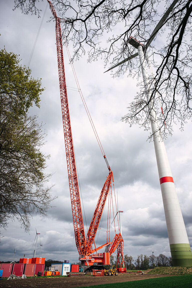 Es gibt alle möglichen Gründe, die uns in eine bestimmte Ortschaft locken. Das können kuriose Ortsnamen sein oder wir sind mal eben auf der Suche nach den Mittelpunkten Deutschlands. Oder einfach nur, weil es für uns nach einem schmucken, gemütlichen Ort im Nirgendwo aussieht. Die Gemeinde Sudwalde im Landkreis Diepholz tanzt da ein bisschen aus der Reihe. Denn hier lag der Grund für unseren Besuch etwas außerhalb der Ortschaft. Um genau zu sein, stand. Um noch genauer zu sein, ragte 220 Meter in die Höhe. Die Rede ist vom Liebherr LR 11000 Mega-Raupenkran. Der war gerade dabei, nördlich von Sudwalde ein Windrad aufzubauen.