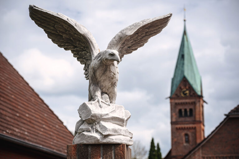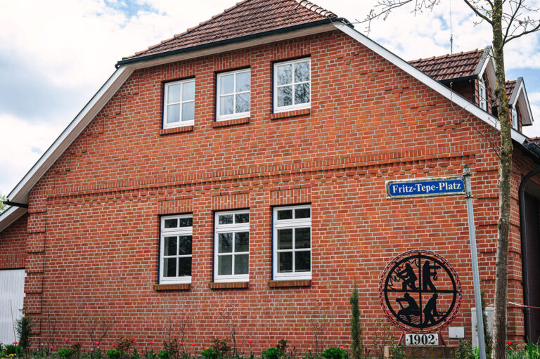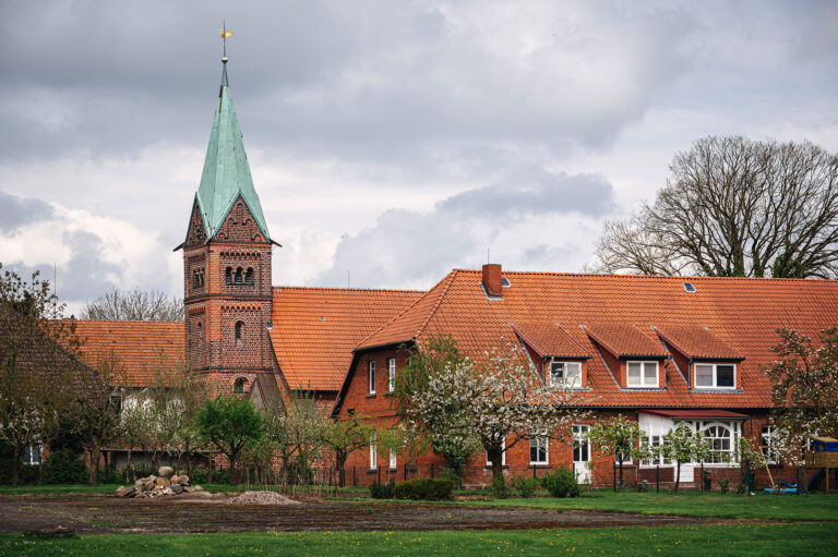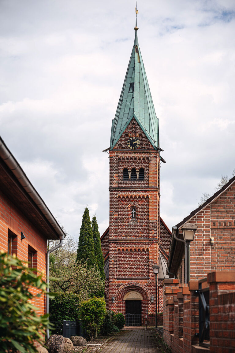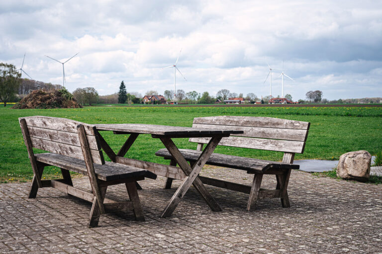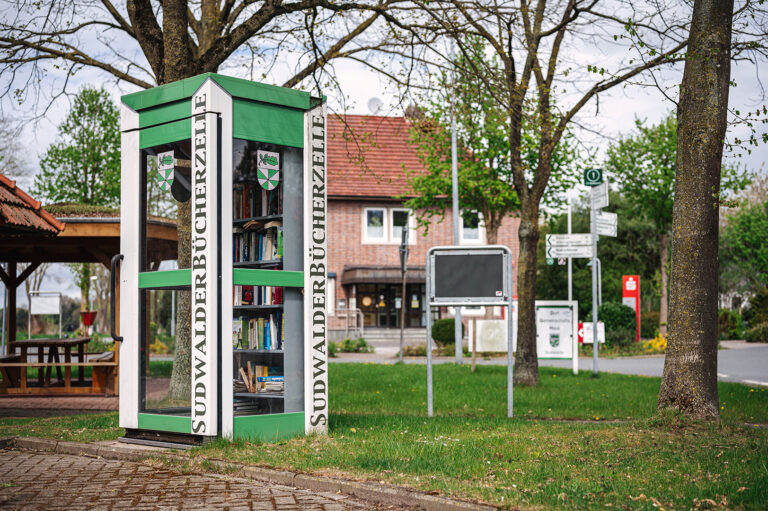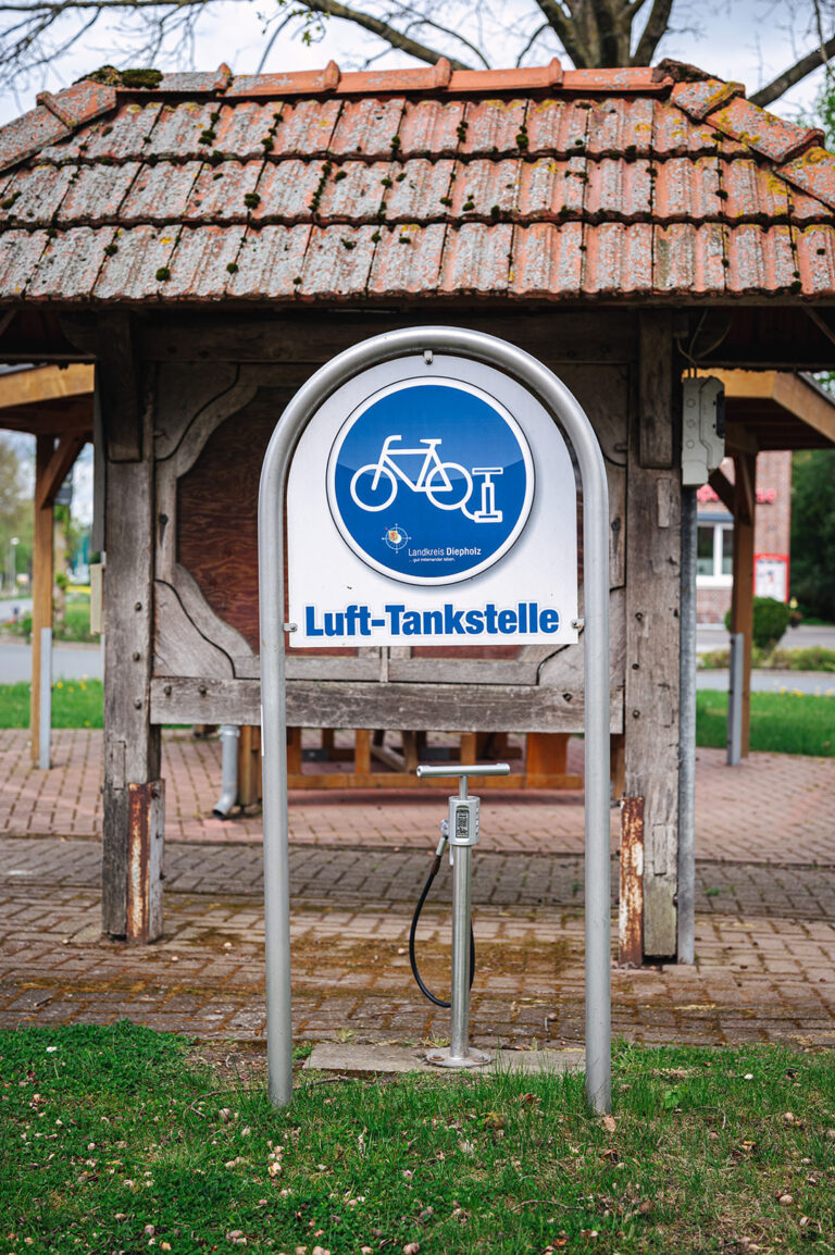 Schnell auf nach Sudwalde. Wir befinden uns hier am Südostrand des Naturparks Wildeshauser Geest. Wem das verständlicherweise überhaupt nichts sagt, das ist ungefähr in der Mitte zwischen Bremen und Minden. Die Ortschaft macht auf uns einen sehr einladenden, gemütlichen und schmucken Eindruck. Sehr viele schöne alte Backsteingebäude. Eine Lufttankstelle für Fahrräder. Gleich nebenan eine Bücherzelle. Nochmal ein paar Meter weiter ein paar Holzbänke und ein Holztisch zum Verweilen. Mit Blick auf die Felder, Wiesen und Windkraftanlagen.